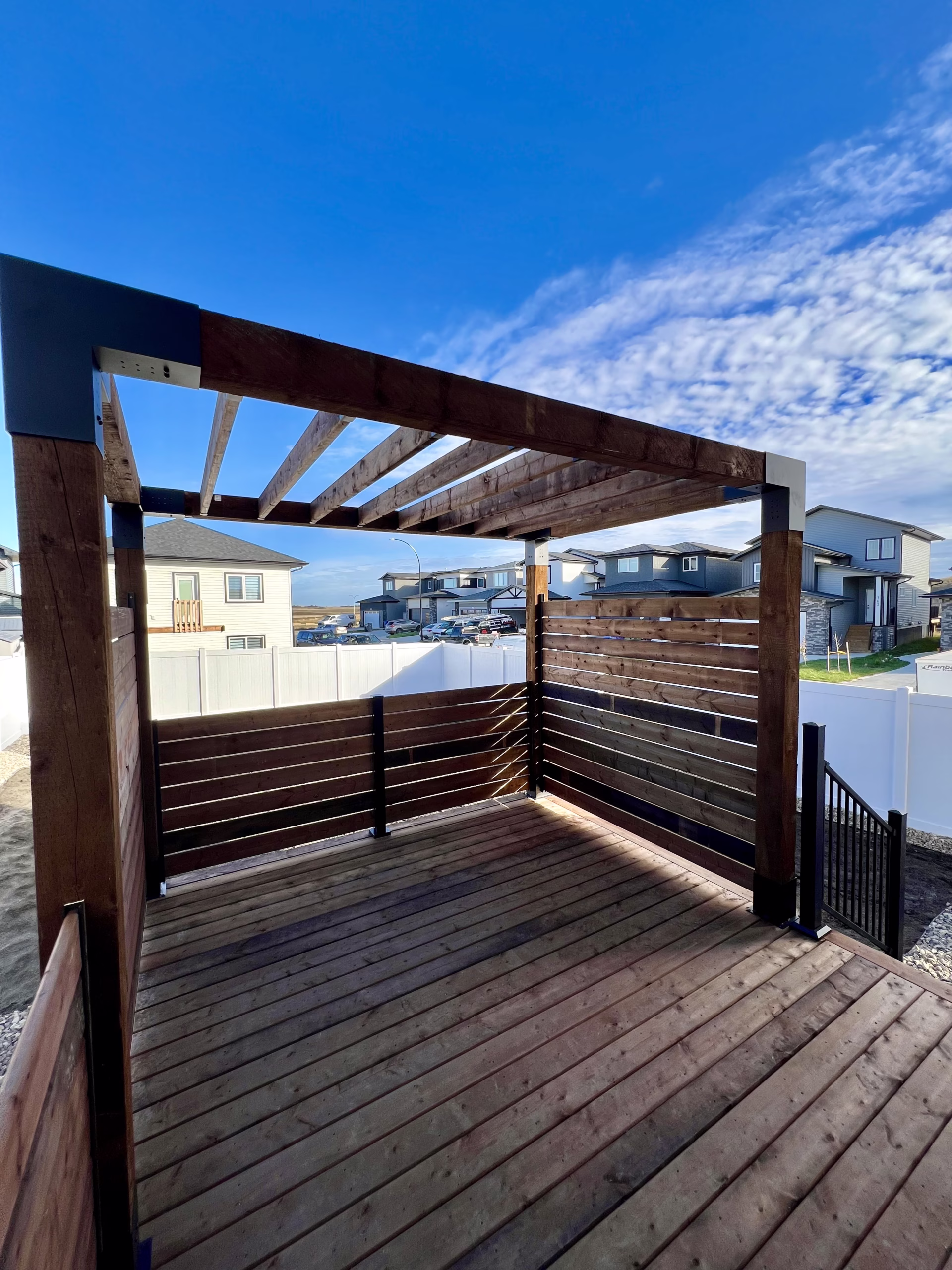 We strongly recommend aluminum railing. It adds a clean, modern finish that elevates the overall look of the deck. It’s also a practical choice as wood railings are typically the most time-consuming and difficult part of a deck to stain and maintain, whereas aluminum offers long-term durability with minimal upkeep.